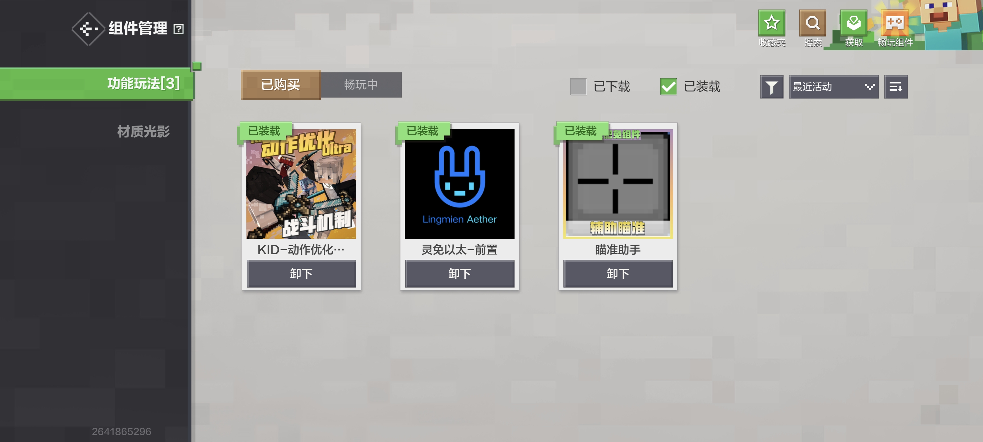 反馈用户:组件列表:灵免以太-前置https://resource-minecraft.h5.163.com/#/detail?id=4674390375086536983&channel=netease瞄准助手https://resource-minecraft.h5.163.com/#/detail?id=4674914866263405787&channel=neteaseKID-动作优化-Ultrahttps://resource-minecraft.h5.163.com/#/detail?id=4649885167922106746&channel=netease灵免以太-屏蔽工具https://resource-minecraft.h5.163.com/#/detail?id=4675427529980979412&channel=netease通过灵免以太前置开启动作优化兼容组件安装:进入游戏、触发头部旋转异常:展开下拉菜单、点击模组设置:选择模组Lingmien Aether,并点击模组设置、开启动作优化兼容:此时如若仍然无效,可安装《灵免以太-屏蔽工具》解决恢复正常: 分享 上一篇 关于希望类java版数据统计模组 下一篇 《方块卡通》中国版代理即将到期 评论交流