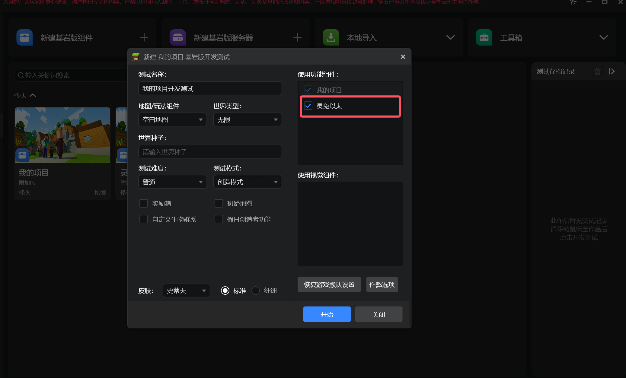 写好脚本代码后,点击自己项目的开发测试,选择测试版本后,在右上角使用功能组件中勾选刚刚导入的测试环境组件一并运行即可正常测试。