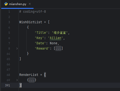- 根据副包脚本文件结构,在ModServer文件夹下创建mianshen.py文件,并在该python文件中定义WishDictList(dictlist)变量并填写抽卡数据信息、定义RenderList(dictlist)变量并填写角色数据信息。