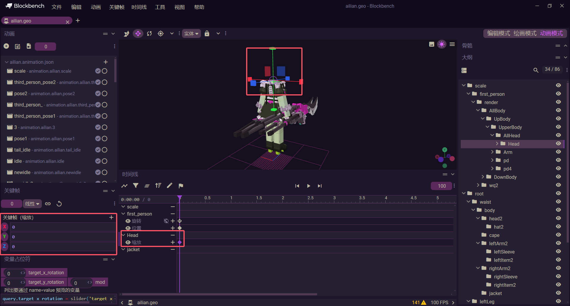 - first_person_idle关键帧应当直接隐藏头,防止在第一人称下被头遮挡,即缩放为(0, 0 ,0)