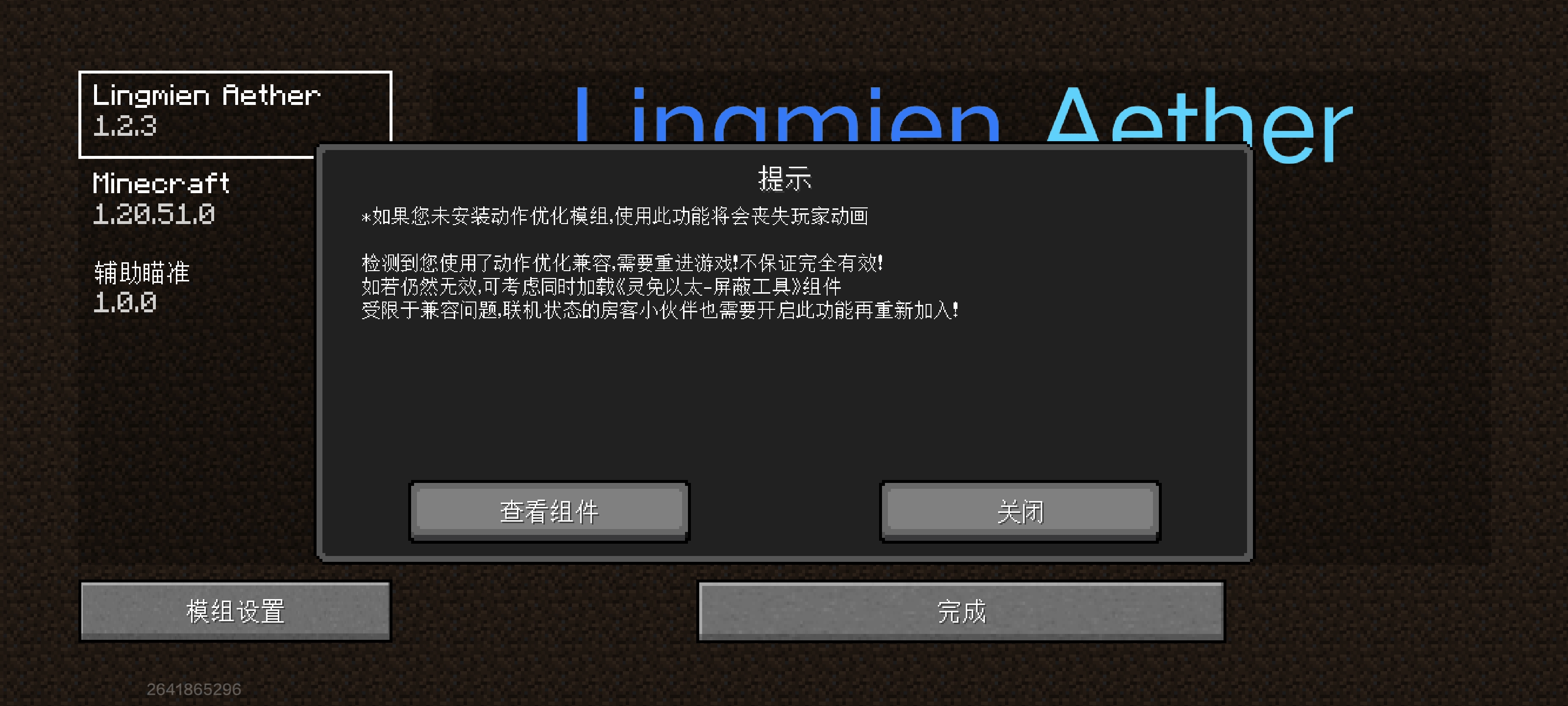 反馈用户:组件列表:灵免以太-前置https://resource-minecraft.h5.163.com/#/detail?id=4674390375086536983&channel=netease瞄准助手https://resource-minecraft.h5.163.com/#/detail?id=4674914866263405787&channel=neteaseKID-动作优化-Ultrahttps://resource-minecraft.h5.163.com/#/detail?id=4649885167922106746&channel=netease灵免以太-屏蔽工具https://resource-minecraft.h5.163.com/#/detail?id=4675427529980979412&channel=netease通过灵免以太前置开启动作优化兼容组件安装:进入游戏、触发头部旋转异常:展开下拉菜单、点击模组设置:选择模组Lingmien Aether,并点击模组设置、开启动作优化兼容:此时如若仍然无效,可安装《灵免以太-屏蔽工具》解决恢复正常: 分享 上一篇 关于希望类java版数据统计模组 下一篇 《方块卡通》中国版代理即将到期 评论交流